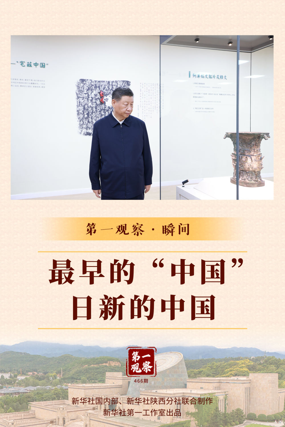 新華社記者的鏡頭定格了這樣的瞬間:總書記在一件國寶級青銅器——何尊前駐足凝視,細致察看。