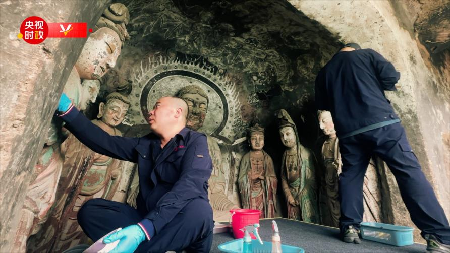 麥積山石窟藝術(shù)研究所工作人員對石窟進行修復