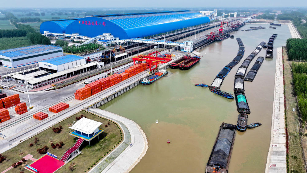2024年4月24日,船舶行駛在山東濟寧港航梁山港航道上(無人機照片)。近年來,山東省加快構(gòu)建沿黃陸海大通道,有效促進(jìn)黃河流域各省區(qū)物流降本增效,實現(xiàn)更高水平對外開放。