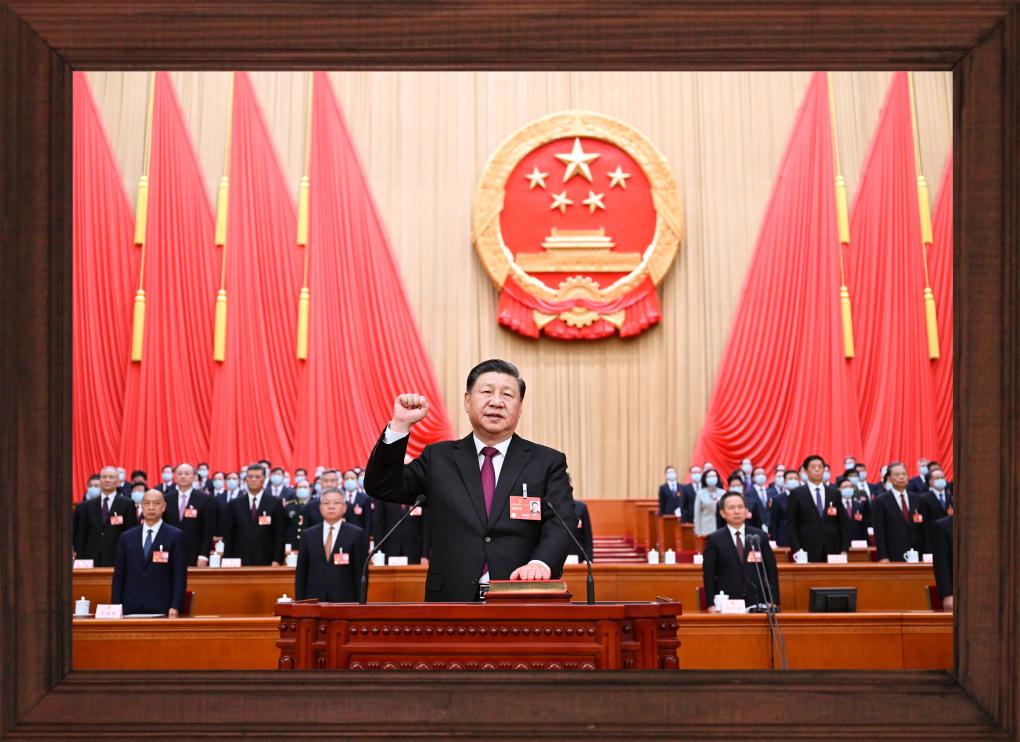 2023年3月10日,北京人民大會堂。全票當(dāng)選國家主席、中央軍委主席的習(xí)近平,左手撫按《中華人民共和國憲法》,右手舉拳,面向近3000名全國人大代表,鄭重宣誓。