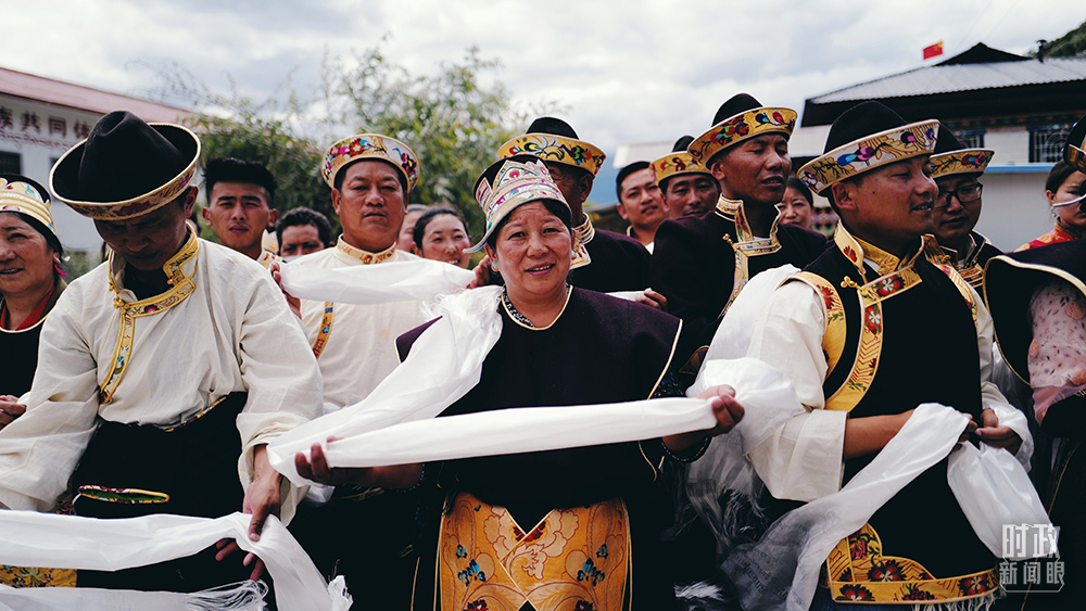 2021年7月,習(xí)近平總書記來到西藏林芝市嘎拉村考察。村民們手捧哈達(dá),熱情迎接。(總臺(tái)央視記者彭漢明拍攝)