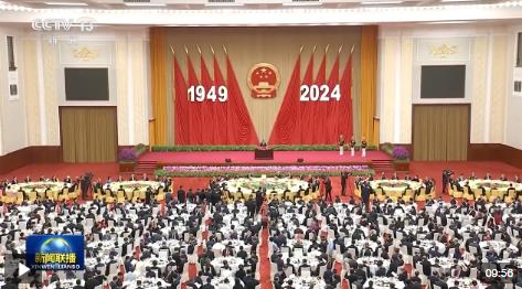 人民大會堂宴會廳華燈璀璨,洋溢著喜慶熱烈的節(jié)日氛圍。主席臺上方高懸著莊嚴(yán)的國徽,“1949-2024”大字年號在鮮艷紅旗映襯下格外醒目。