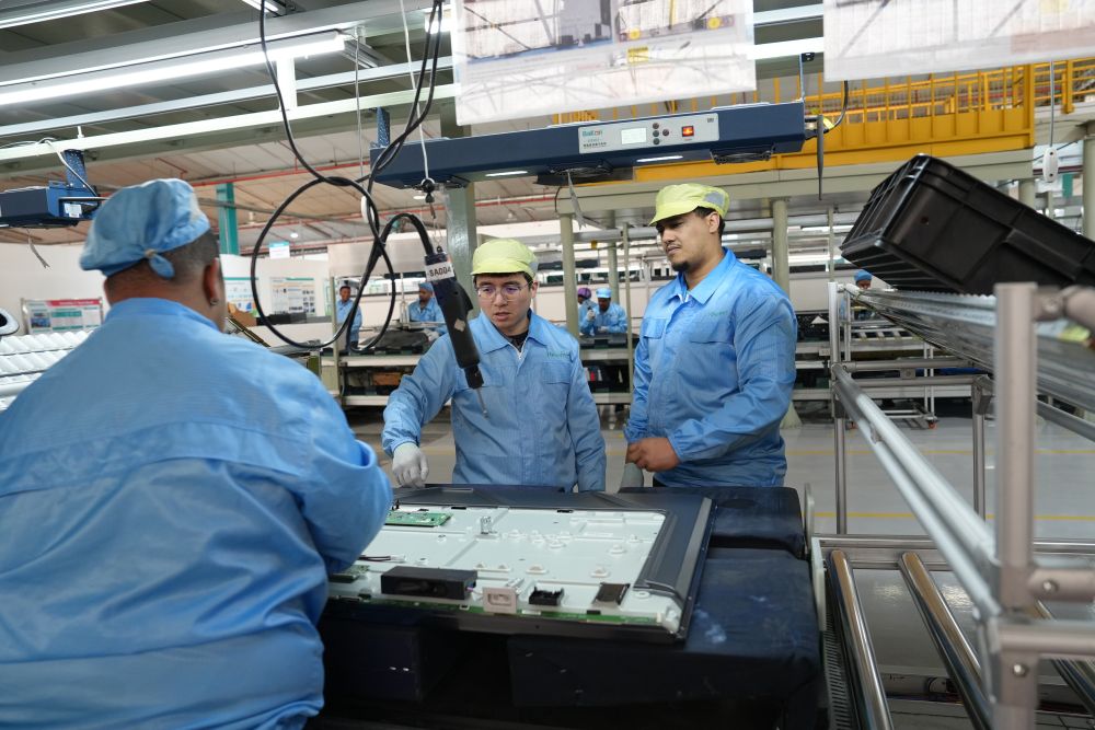 2024年8月14日,中方工程師(中)在南非開普敦的海信南非工業(yè)園電視機生產線上指導當地員工工作。工業(yè)園已為當地創(chuàng)造1000多個直接就業(yè)機會、5000多個間接就業(yè)崗位,帶動地區(qū)產業(yè)鏈發(fā)展。