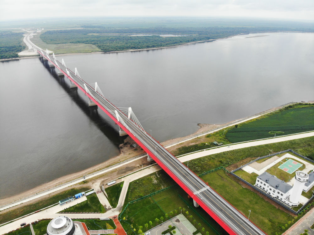 這是在中國黑河一側拍攝的黑河-布拉戈維申斯克公路橋(2023年8月11日攝,無人機照片)。2022年6月10日,這座中俄首座跨黑龍江公路大橋正式通車,在中國東北地區(qū)和俄羅斯遠東地區(qū)之間開辟了新的國際運輸通道。