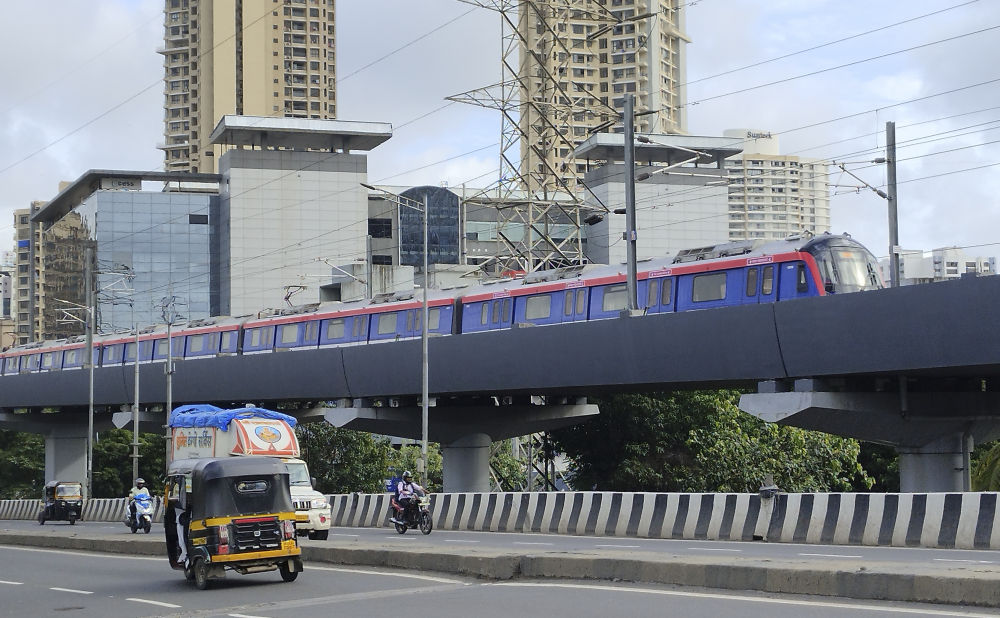 這是在印度孟買北部已開通運行路段拍攝的地鐵列車(2022年6月22日攝)。新開發(fā)銀行向印度孟買北部地鐵項目提供了貸款,項目第一部分已于2022年4月開通運營,緩解了沿線地區(qū)的城市交通壓力。新華社發(fā)(阿西夫攝)