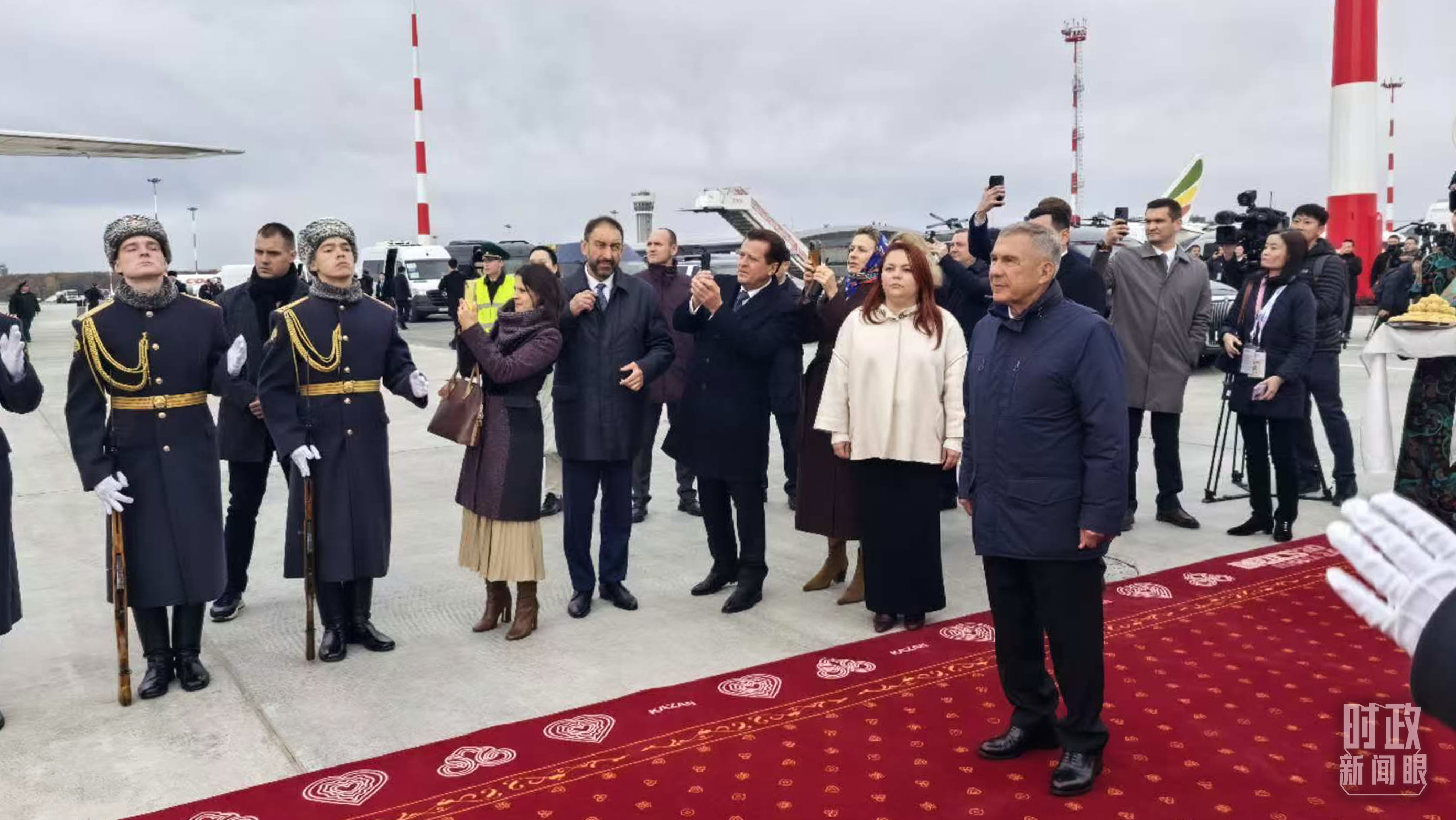 習(xí)主席專機(jī)抵達(dá)喀山國(guó)際機(jī)場(chǎng)時(shí),俄羅斯聯(lián)邦韃靼斯坦共和國(guó)行政長(zhǎng)官等在機(jī)場(chǎng)熱情迎接。(總臺(tái)央視記者王鵬飛拍攝)