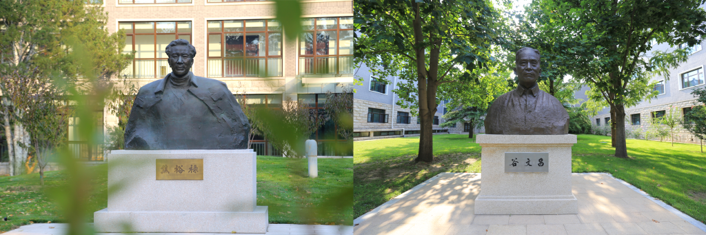 左圖為中央黨校(國家行政學(xué)院)校園內(nèi)的焦裕祿雕塑,右圖為校園內(nèi)的谷文昌雕塑。