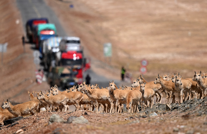 2023年5月29日,當?shù)毓芾聿块T工作人員在青藏公路上臨時截停來往車輛,為一群前往可可西里卓乃湖產(chǎn)仔的藏羚羊讓路。可可西里地處三江源國家公園,是國家一級保護動物藏羚羊重要的棲息地。每年5月至7月,來自青海三江源、新疆阿爾金山、西藏羌塘的雌性藏羚羊會遷徙到可可西里卓乃湖,待產(chǎn)仔后再攜幼仔返回原棲息地。