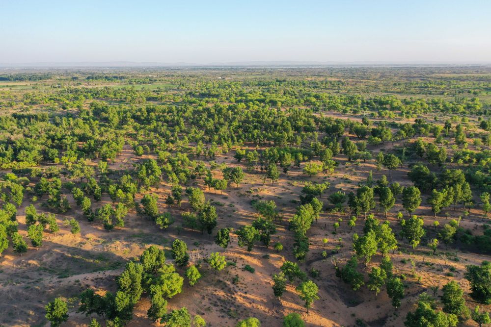 2023年6月14日在內(nèi)蒙古毛烏素沙地拍攝的當?shù)啬撩穹N植的一片樹林(無人機照片)。2024年以來,內(nèi)蒙古全面開展“三北”工程攻堅戰(zhàn),已完成防沙治沙面積約1954萬畝,約為年度總?cè)蝿?730萬畝的113%,超額完成年度任務。