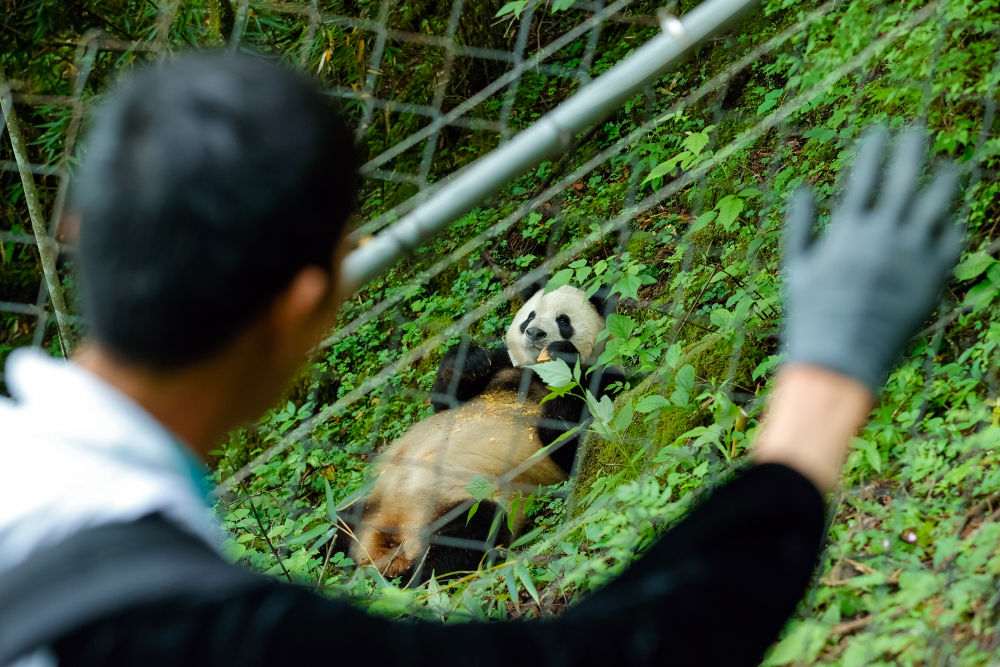 2024年6月24日,在位于大熊貓國家公園臥龍片區(qū)內(nèi)天臺山的大熊貓第二階段野化培訓場外,工作人員給母熊貓“賢賢”投喂完食物后揮手向其告別。近年來,我國通過大力實施天然林保護、野生動植物保護和大熊貓國家公園建設等,保護大熊貓及其棲息地,成效顯著。大熊貓野外種群總量已從20世紀80年代的約1100只增長到近1900只。
