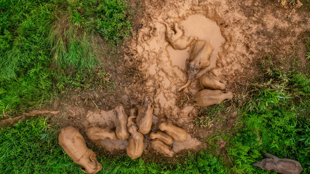 2024年8月8日,“短鼻家族”和“然然家族”的野象在云南省西雙版納州景洪市大渡崗鄉(xiāng)的泥塘里玩耍(無人機照片)。近年來,云南修復改造了一些大象棲息地,種植大象愛吃的植物,同時運用紅外相機等技術(shù)手段,實現(xiàn)亞洲象位置信息的實時發(fā)布。