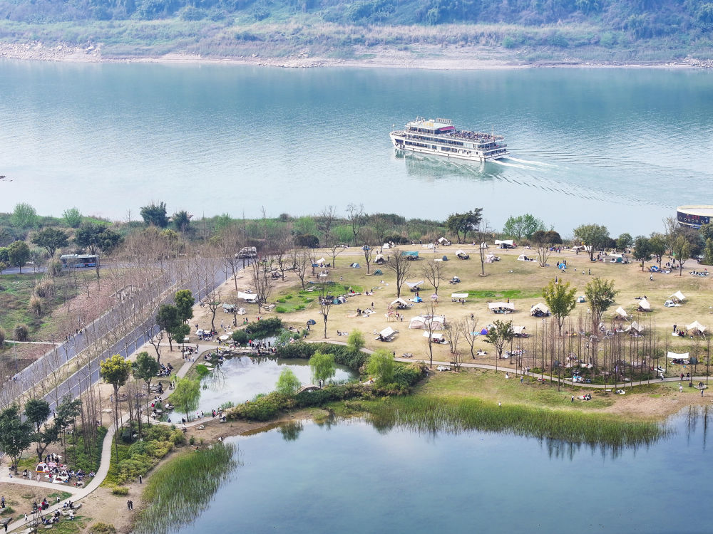 2024年3月16日,游客在重慶廣陽島東島頭一帶游覽、休閑(無人機照片)。廣陽島是長江上游最大的江心島。近年來,當?shù)叵到y(tǒng)推進自然恢復、生態(tài)修復,豐富生物多樣性。2024年,重慶廣陽島生態(tài)修復項目成功入選聯(lián)合國“生態(tài)恢復十年”優(yōu)秀案例。