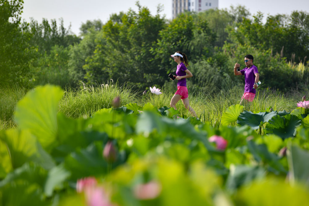 2024年6月23日,市民在陜西省漢中市天漢濕地公園內(nèi)運動休閑。漢江是長江的最大支流,是南水北調(diào)中線工程的重要水源。近年來,漢中市加強對漢江源頭和沿岸濕地生態(tài)保護修復,構(gòu)建人水和諧共生的美麗城市,確?!耙汇逅览m(xù)北上”。