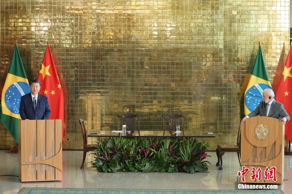 當?shù)貢r間11月20日,中國國家主席習近平在巴西利亞總統(tǒng)官邸同巴西總統(tǒng)盧拉舉行會談。會談后,兩國元首共同會見記者。中新社記者 盛佳鵬 攝