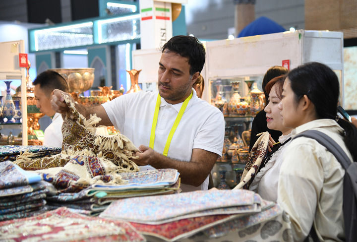 2024年9月20日,在陜西省西安市舉行的第八屆絲綢之路國際博覽會上,來自伊朗的參展商(前左一)向觀眾介紹產(chǎn)品。 新華社記者 張博文 攝
