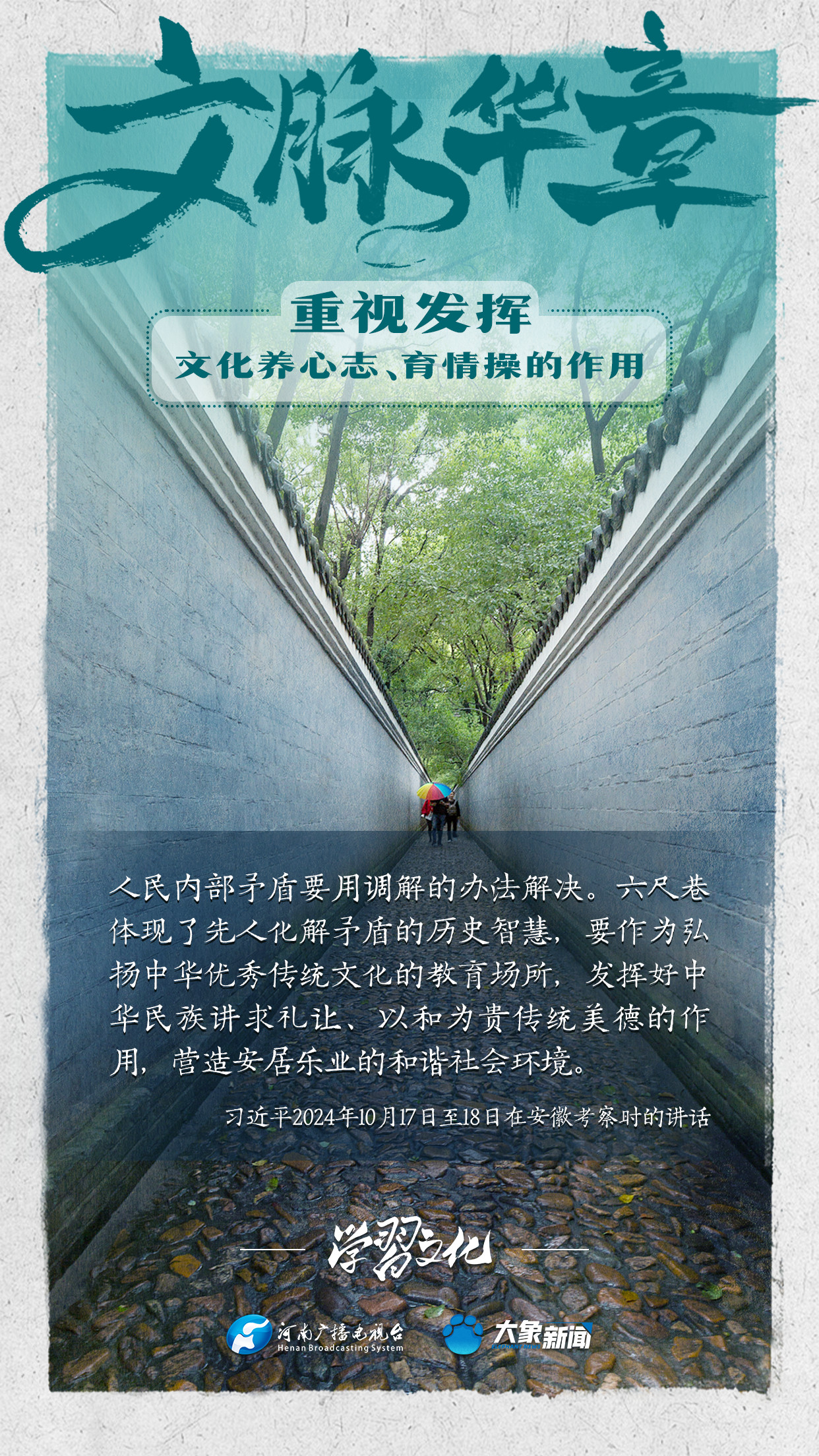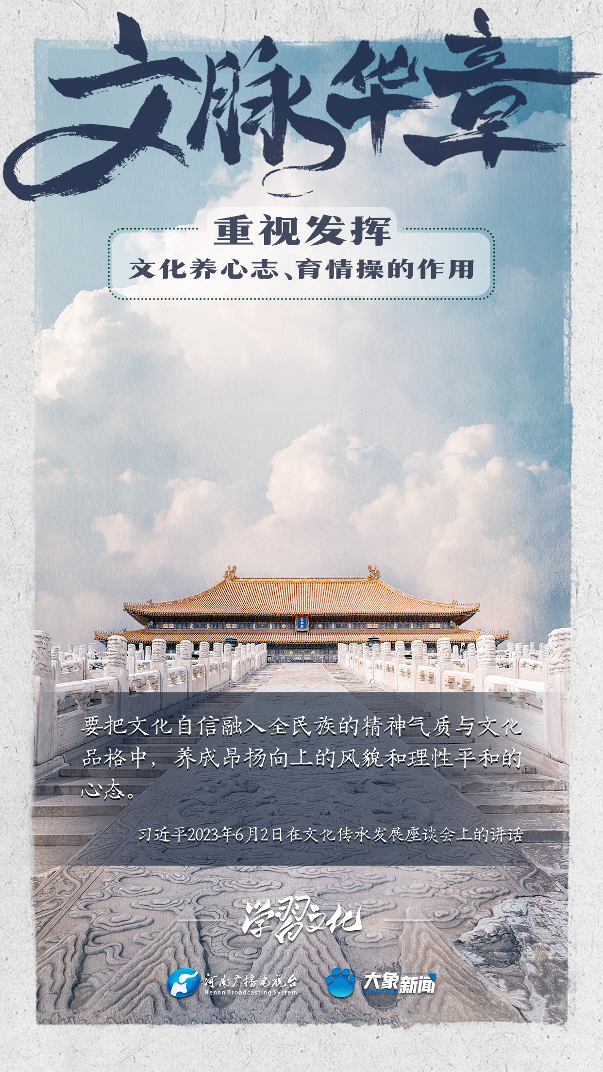 習(xí)近平總書記在主持中共中央政治局第十七次集體學(xué)習(xí)時(shí)強(qiáng)調(diào),重視發(fā)揮文化養(yǎng)心志、育情操的作用,涵養(yǎng)全民族昂揚(yáng)奮發(fā)的精神氣質(zhì)??倳浉叨戎匾曃幕淖饔?,發(fā)表了一系列重要講話,倡導(dǎo)以文載道、以文傳聲、以文化人。我們一起學(xué)習(xí)。