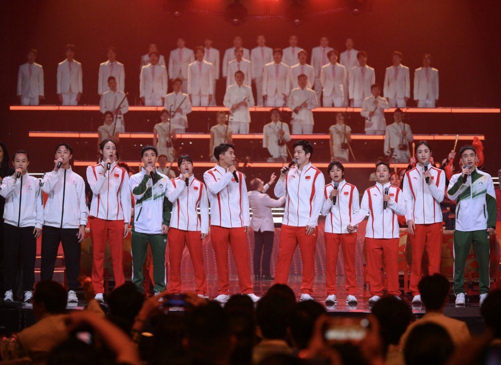 2024年9月22日,在2024“灣區(qū)升明月”大灣區(qū)電影音樂晚會上,澳門體育運動員代表與參加巴黎奧運會的內(nèi)地健兒一起演唱歌曲。