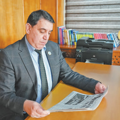 蘇赫羅普·勞夫佐達(dá)閱讀塔吉克斯坦《人民論壇報(bào)》與中國相關(guān)的報(bào)道。劉帥杰攝