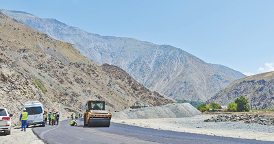 中塔公路二期項(xiàng)目建設(shè)現(xiàn)場,兩國工作人員正在平整瀝青路面。本報(bào)記者 程是頡攝