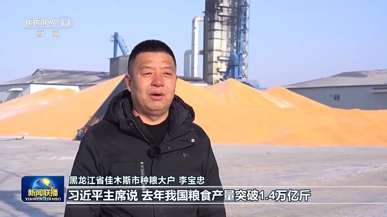 黑龍江省佳木斯市種糧大戶 李寶忠:習(xí)近平主席說(shuō),去年我國(guó)糧食產(chǎn)量突破1.4萬(wàn)億斤,中國(guó)碗裝了更多中國(guó)糧。聽到這話我心里特別自豪。今年春耕之前,我們要更新購(gòu)置大型高端智能的玉米收割機(jī),我要和鄉(xiāng)親們一起加油干,在農(nóng)業(yè)現(xiàn)代化的道路上扎實(shí)走好每一步,用我們的雙手把中國(guó)飯碗端得更牢。