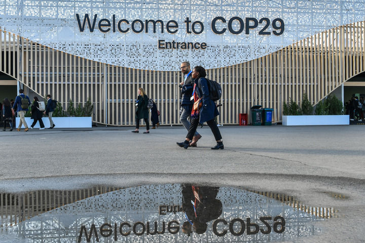 2024年11月15日,在阿塞拜疆首都巴庫,人們經(jīng)過聯(lián)合國氣候變化巴庫大會(huì)的會(huì)場。新華社記者 曹陽 攝