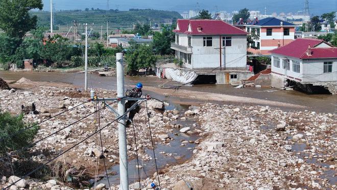 2024年8月22日,葫蘆島市電力部門(mén)工作人員在搶修因洪災(zāi)中斷的線路。
