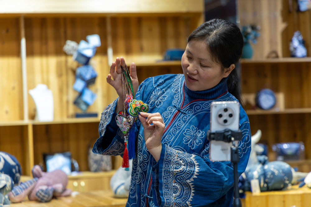 2025年3月14日,村民在肇興侗寨內(nèi)通過手機(jī)直播銷售刺繡作品。侗繡承載著侗族人的信仰與記憶,年輕繡娘的手藝多半來自母親傳承,侗族婦女用一針一線將民族古老的神話傳說、歷史風(fēng)俗記錄在服飾的紋樣里,讓這門手藝在侗鄉(xiāng)世代傳承。2011年,侗族刺繡被列入國家級非物質(zhì)文化遺產(chǎn)名錄。