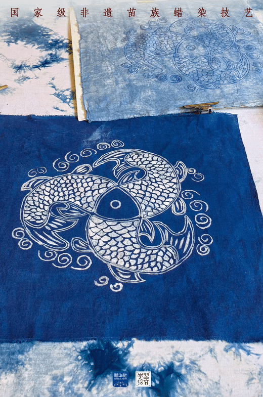 染色,就是將畫好圖案的土布,放入藍(lán)靛染缸中,反復(fù)浸泡多次,確保其上色。其間,作為防染劑的蠟自然龜裂,使布面呈現(xiàn)特殊的“冰紋”,具有獨(dú)特魅力。