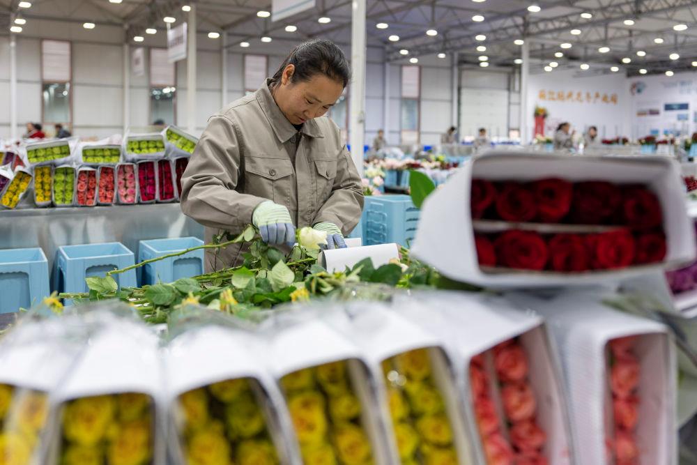 △近日,工作人員在云南麗江現代花卉產業(yè)園包裝鮮花。