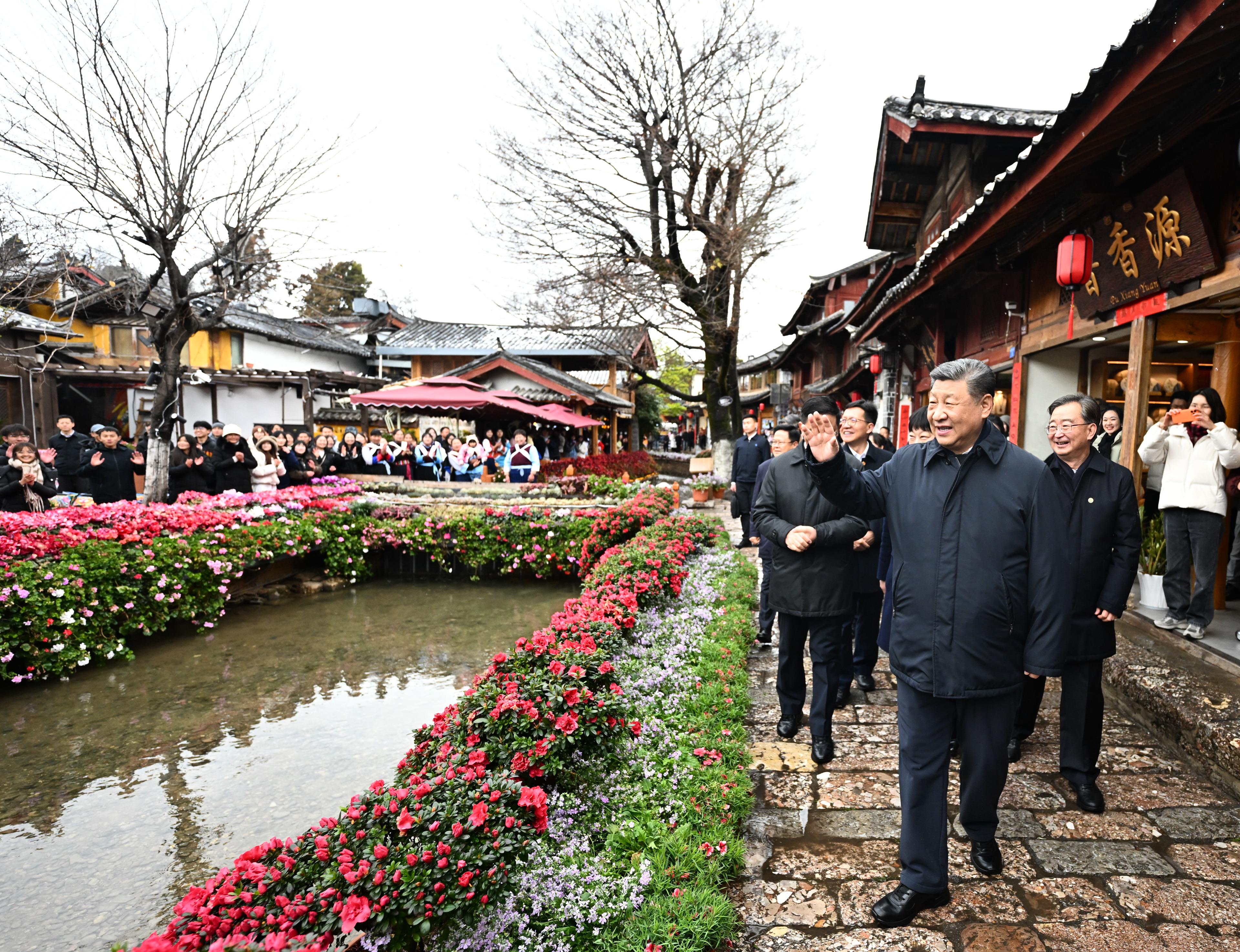 △2025年3月19日,習(xí)近平總書記在云南麗江古城考察時(shí),與居民、游客互動(dòng)交流。