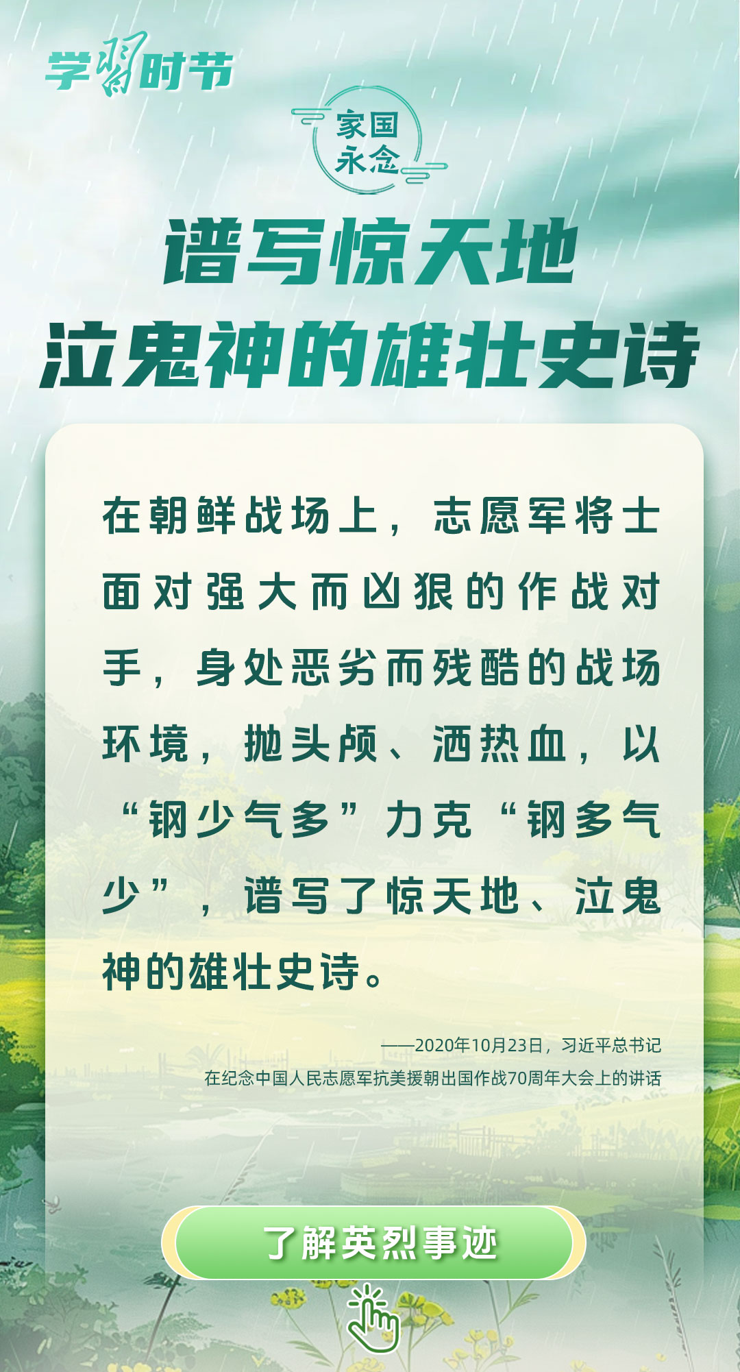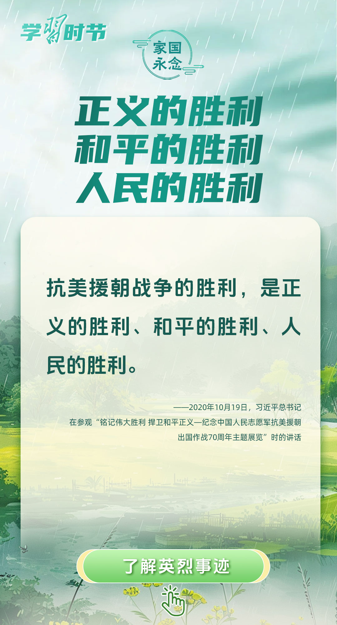 今年是中國人民抗日戰(zhàn)爭暨世界反法西斯戰(zhàn)爭勝利80周年、中國人民志愿軍抗美援朝出國作戰(zhàn)75周年。習近平總書記曾說:“對一切為國家、為民族、為和平付出寶貴生命的人們,不管時代怎樣變化,我們都要永遠銘記他們的犧牲和奉獻?!苯裉煳覀兯鶕碛械囊磺校瑹o不凝結(jié)著英雄、英烈們的奉獻付出乃至巨大犧牲。