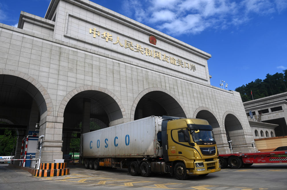 2024年8月26日,一輛貨車通過廣西憑祥友誼關(guān)口岸。友誼關(guān)口岸是西部陸海新通道的重要節(jié)點,是中國通往東盟最大的陸路口岸,也是我國通往越南最便捷的陸路大通道之一。滿載著東盟國家特色水果、農(nóng)副產(chǎn)品與中國電子配件、大型設(shè)備等貨品的車輛在此“雙向奔赴”、川流不息。2024年,友誼關(guān)口岸年內(nèi)出入境貨車數(shù)量首次突破50萬輛次,同比增長15.96%,創(chuàng)歷史新高。