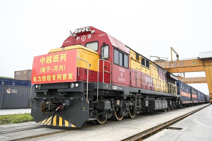 2024年3月8日,在廣西南寧國際鐵路港,電力鐵塔專列準備發(fā)車。當日,一列滿載340噸電力鐵塔的中越班列從南寧國際鐵路港開出,發(fā)往越南河內(nèi)。新華社記者 曹祎銘 攝