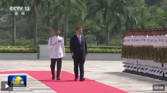 習(xí)近平乘車抵達(dá)時,易卜拉欣和馬來西亞總理安瓦爾在下車處熱情迎接。兩國元首登上檢閱臺,軍樂團(tuán)奏中馬兩國國歌,鳴禮炮21響。習(xí)近平檢閱儀仗隊。兩國元首進(jìn)入國家王宮大廳,同雙方陪同人員握手致意。