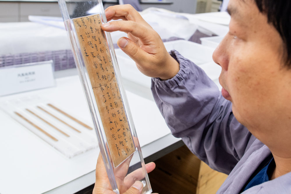 2023年5月20日,湖北荊州文物保護(hù)中心的修復(fù)人員史少華在查看修復(fù)完成的簡牘。荊州文物保護(hù)中心是我國簡牘修復(fù)領(lǐng)域?qū)嵙ψ顝?qiáng)的機(jī)構(gòu)之一,近年來累計(jì)完成13萬多枚竹木簡牘的脫水工作,飽水簡牘修復(fù)量占全國90%以上。