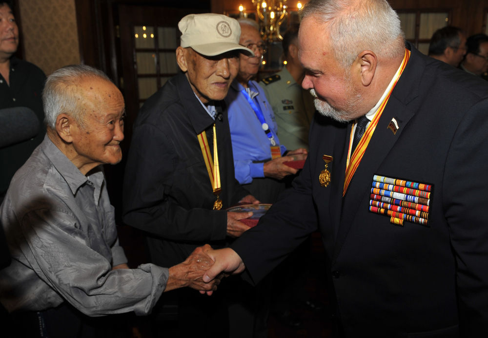 2015年9月5日,二戰(zhàn)蘇軍著名統(tǒng)帥瓦西里·崔可夫的外孫尼古拉·崔可夫(前右)與中國(guó)抗戰(zhàn)老兵代表在活動(dòng)現(xiàn)場(chǎng)交流。新華社記者 魯鵬 攝