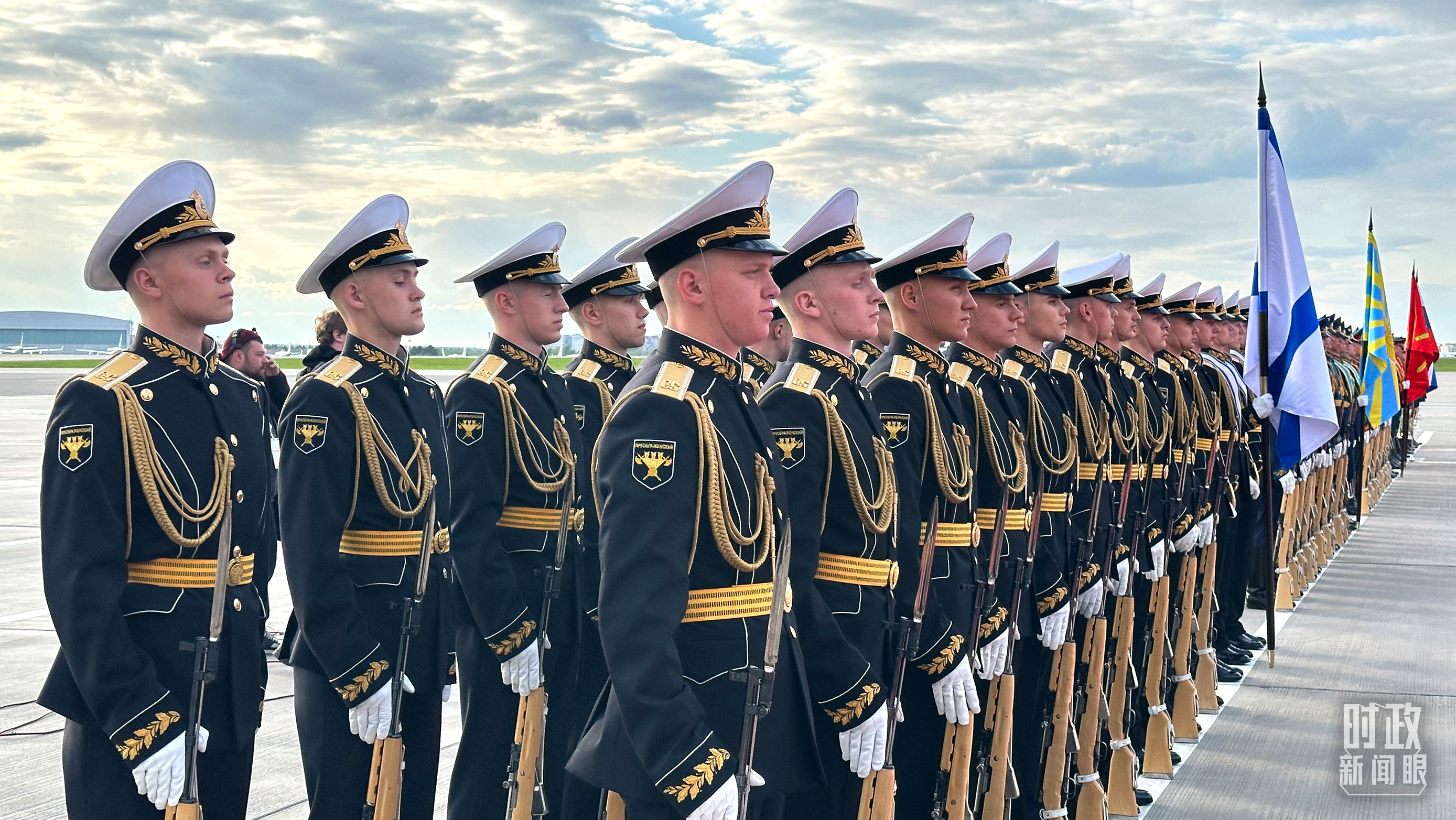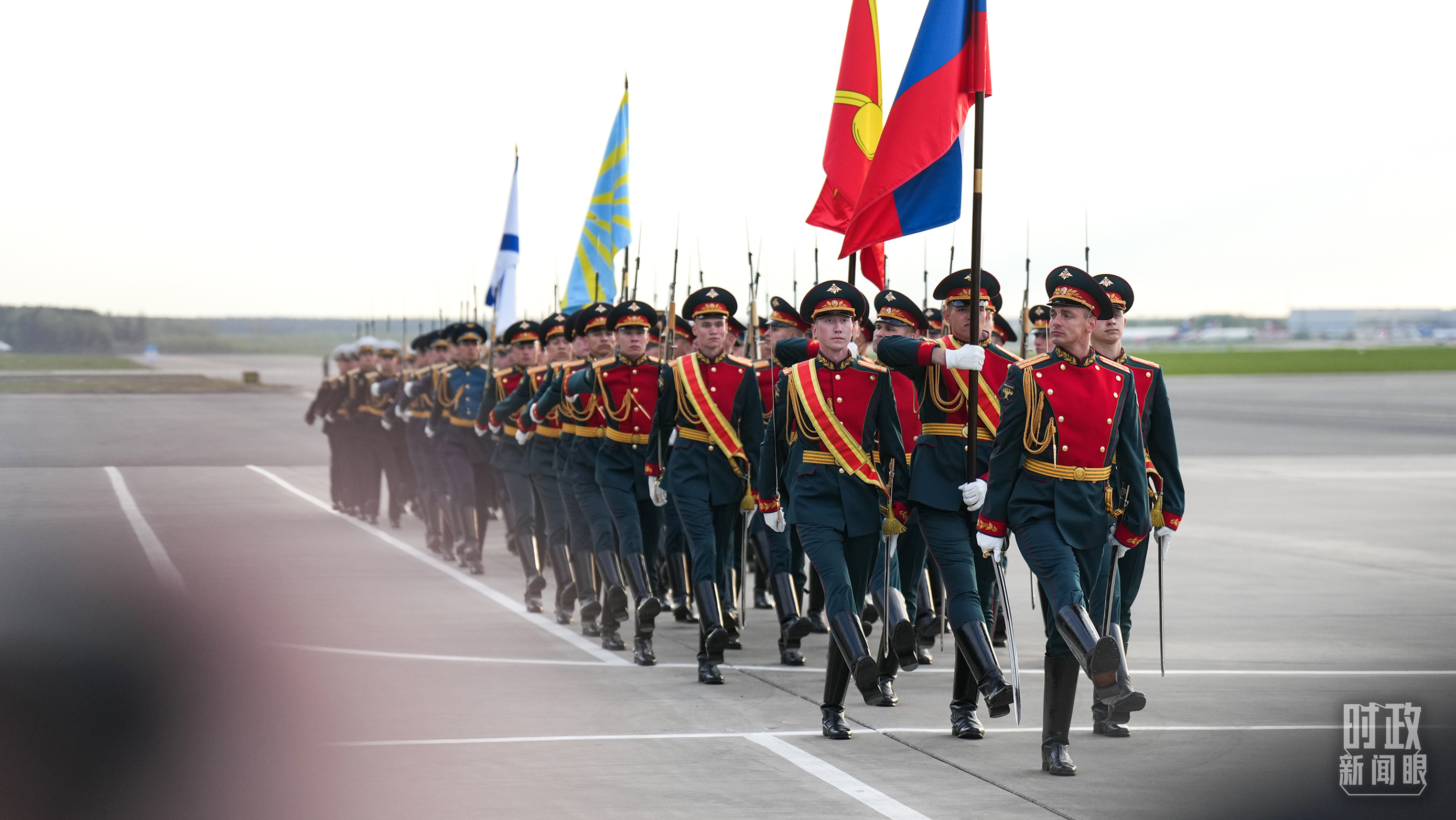 俄方在機(jī)場(chǎng)舉行隆重迎接儀式。軍樂(lè)團(tuán)奏中俄兩國(guó)國(guó)歌。習(xí)主席檢閱儀仗隊(duì)并觀看分列式。