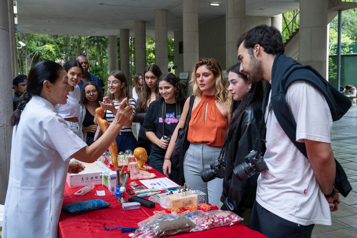 2025年4月15日,在巴西里約熱內(nèi)盧天主教大學(xué)舉辦的“國(guó)際中文日”慶祝活動(dòng)上,學(xué)生們觀看中醫(yī)療法展示。