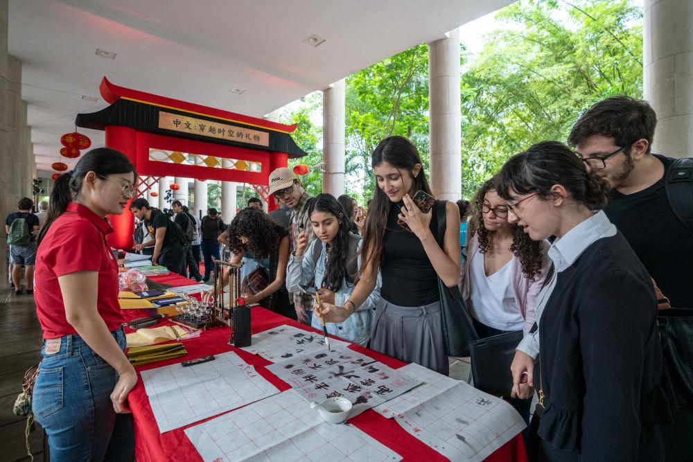 2025年4月,在巴西里約熱內(nèi)盧天主教大學舉辦的“國際中文日”慶?;顒由希瑢W生們體驗中文書法。