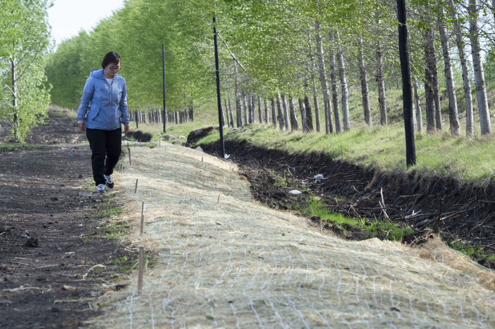 2022年5月23日,在黑龍江省海倫市前進(jìn)鎮(zhèn)光榮村,黑龍江省農(nóng)業(yè)科學(xué)院科研人員在進(jìn)行坡面生態(tài)修復(fù)的黑土坡耕地中查看治理情況。