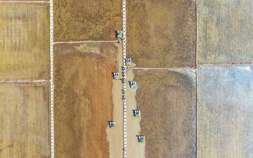 2022年5月13日,在遼寧省鐵嶺市鐵嶺縣新臺子鎮(zhèn),農(nóng)民駕駛農(nóng)機(jī)在稻田里插秧(無人機(jī)照片)。
