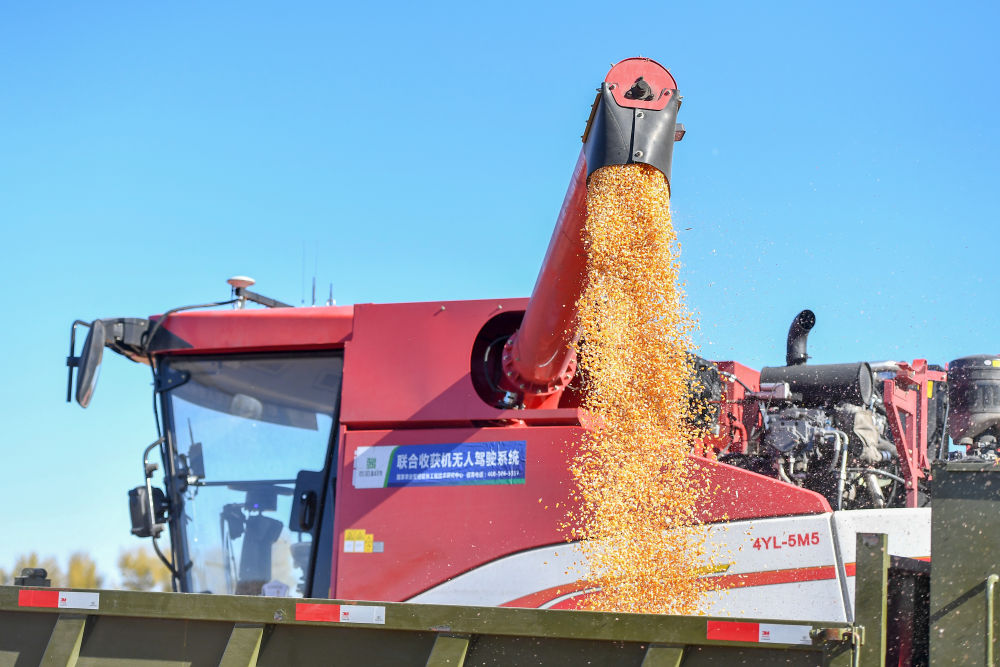 2023年10月19日,在中國科學(xué)院“黑土糧倉”科技會戰(zhàn)長春示范區(qū)公主嶺示范基地,無人駕駛農(nóng)機(jī)將收獲的玉米裝車。