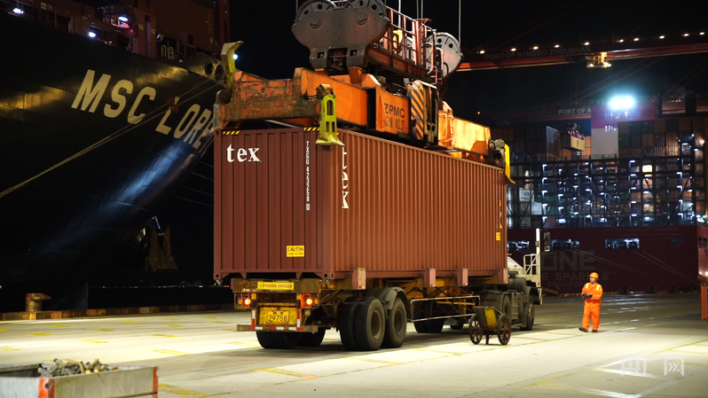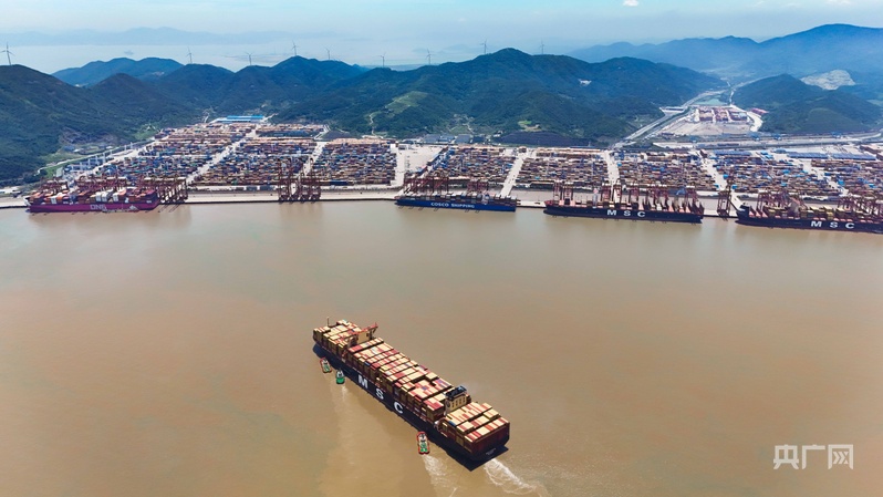 滿載貨物的“地中海洛雷托”號(hào)正緩緩靠泊寧波舟山港(央廣網(wǎng)記者 尚天宇 攝)
