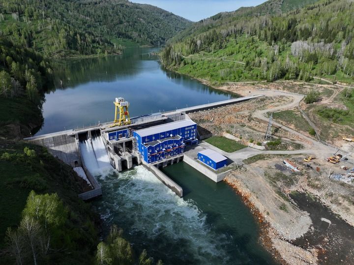 這是2025年5月8日在哈薩克斯坦東哈州拍攝的圖爾古孫水電站(無人機照片)。新華社記者 李任滋 攝
