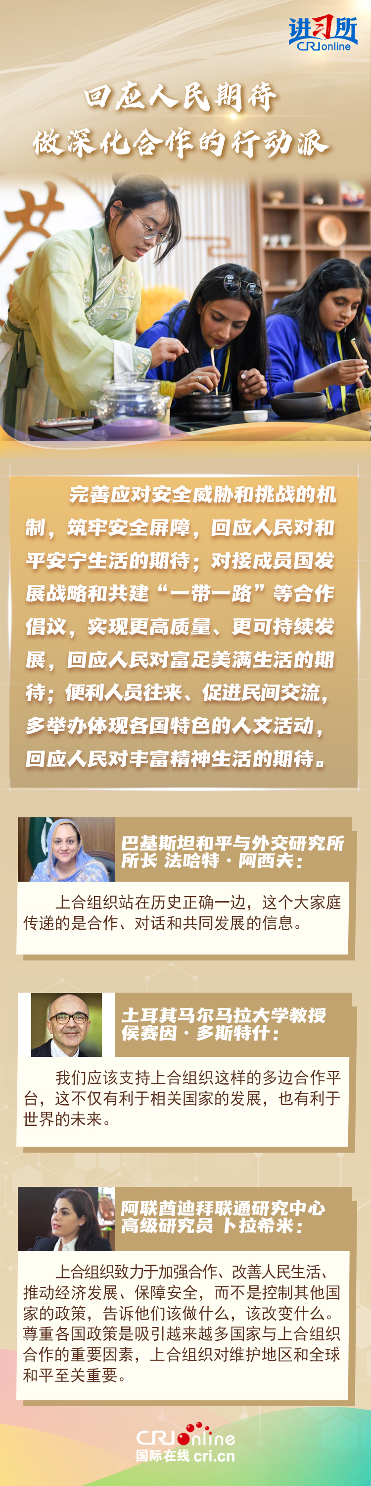 “讓‘上海精神’持續(xù)照亮構(gòu)建上海合作組織命運(yùn)共同體之路?!鄙虾:献鹘M織成立24年來,始終秉持“上海精神”,成功走出了一條順應(yīng)時代潮流、契合各方需求的區(qū)域合作道路,樹立起新型國際關(guān)系的典范。在國際人士眼中,上海合作組織站在歷史正確一邊,致力于建設(shè)一個更加平等,更加包容,更加公平公正的世界,對維護(hù)地區(qū)和全球和平至關(guān)重要。