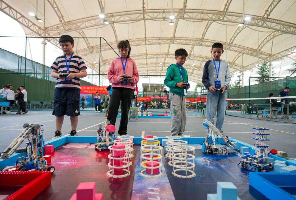 5月31日,四名參賽選手在全國青少年科技教育成果展示大賽云南省區(qū)域賽上操作機(jī)器人進(jìn)行比賽。新華社記者 陳欣波 攝