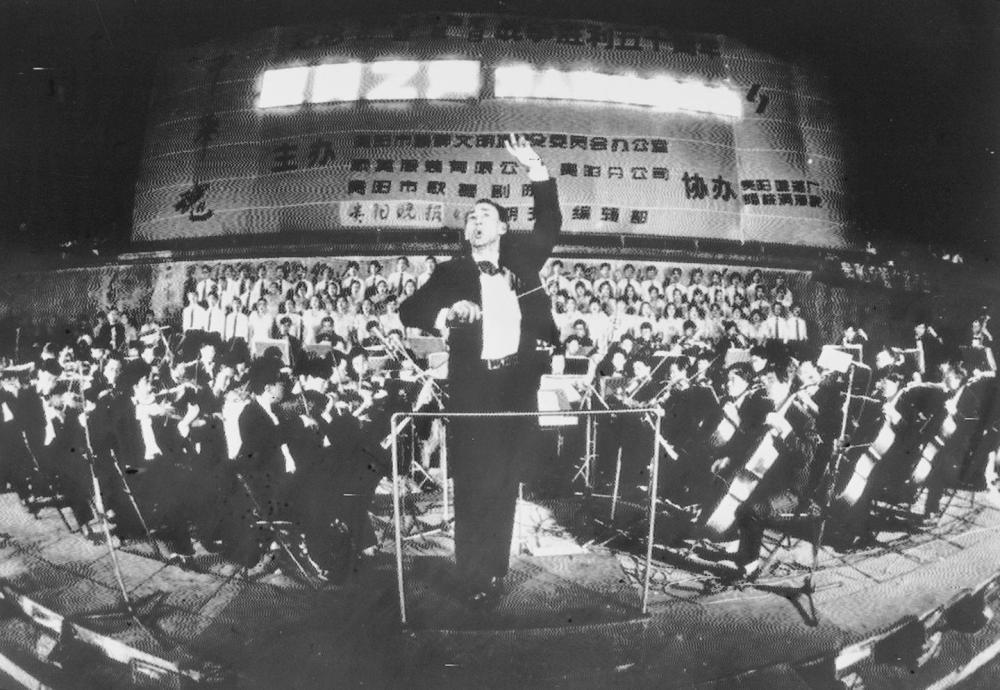 1995年,56所首都高校的1萬(wàn)名大學(xué)生在北京首都體育館參加紀(jì)念中國(guó)人民抗日戰(zhàn)爭(zhēng)勝利50周年首都大學(xué)生《黃河大合唱》萬(wàn)人演唱會(huì)。