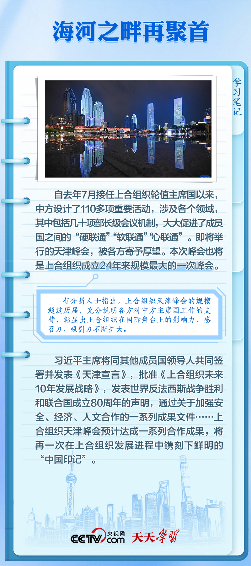 天天學(xué)習(xí)8月31日至9月1日,2025年上海合作組織峰會(huì)將在天津舉行。習(xí)近平主席將同20多位外國領(lǐng)導(dǎo)人和10位國際組織負(fù)責(zé)人聚首海河之濱,出席上合組織成立以來規(guī)模最大的一次峰會(huì)。