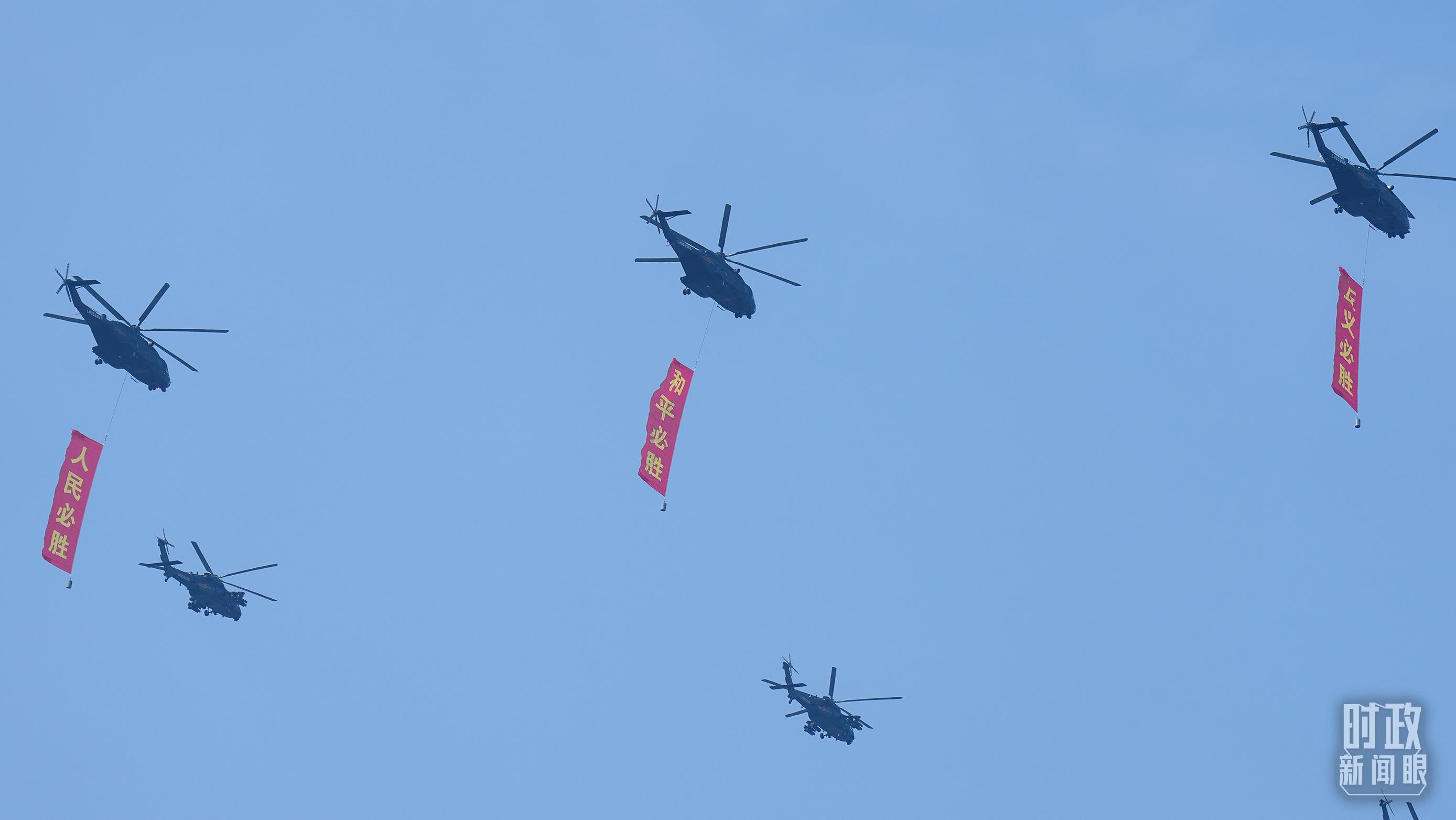 △9月3日,3架直升機(jī)分別懸掛“正義必勝”“和平必勝”“人民必勝”條幅飛過天安門廣場(chǎng)。(總臺(tái)記者李晉拍攝)