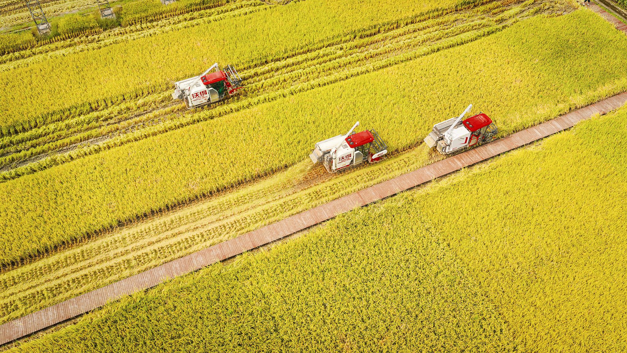 △2025年9月14日,四川成都崇州市隆興鎮(zhèn)十萬畝糧食綜合示范基地水稻喜獲豐收。